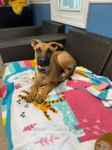 Rosie was a bait dog that came to us with heartworms. She was a puppy who had puppies. She is a certified emotional support dog